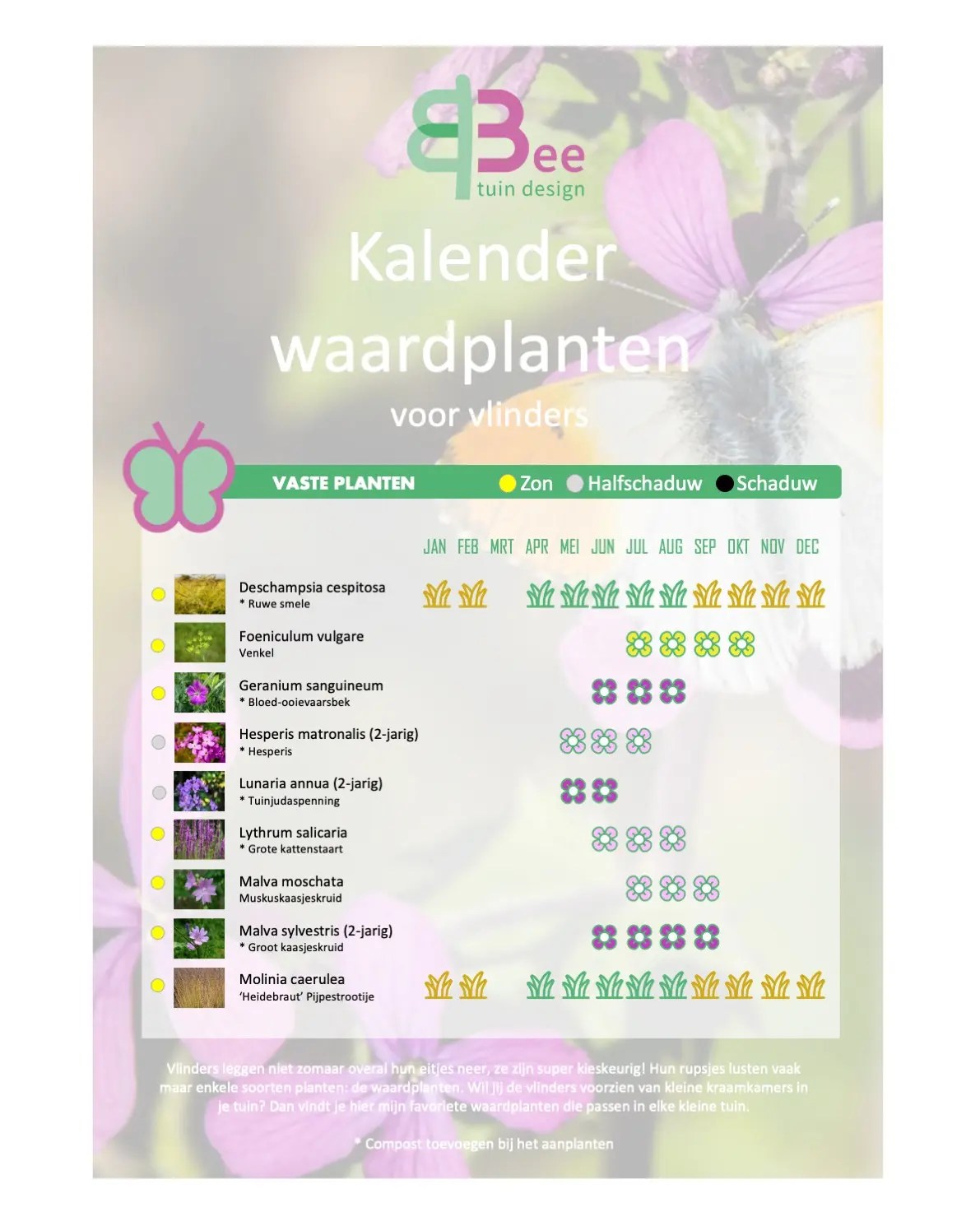 Download hier de kalender met mijn favoriete waardplanten en begin vandaag nog met het aanplanten van deze vlindervriendelijke soorten. Geniet straks van een tuin vol vlinders en de levendigheid die zij brengen. Zet de eerste stap naar een duurzame en ecologische tuin en draag bij aan de bescherming van deze waardevolle bestuivers!